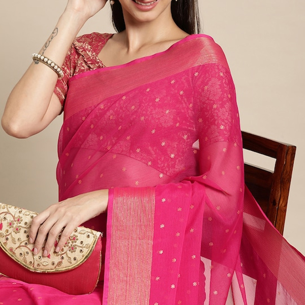 Pink & Gold-Toned Floral Zari Pure Chiffon Saree